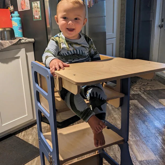 High chair add-on for kitchen towers! Just like the tower itself, it's a game-changer for your child's everyday routine. From mealtime to playtime, this add-on simplifies tasks and fosters independence. Plus, it doubles as a swing and step stool, combining multiple functions into one compact piece. With this innovative addition, mealtimes become more efficient, and your child becomes more involved in daily tasks.